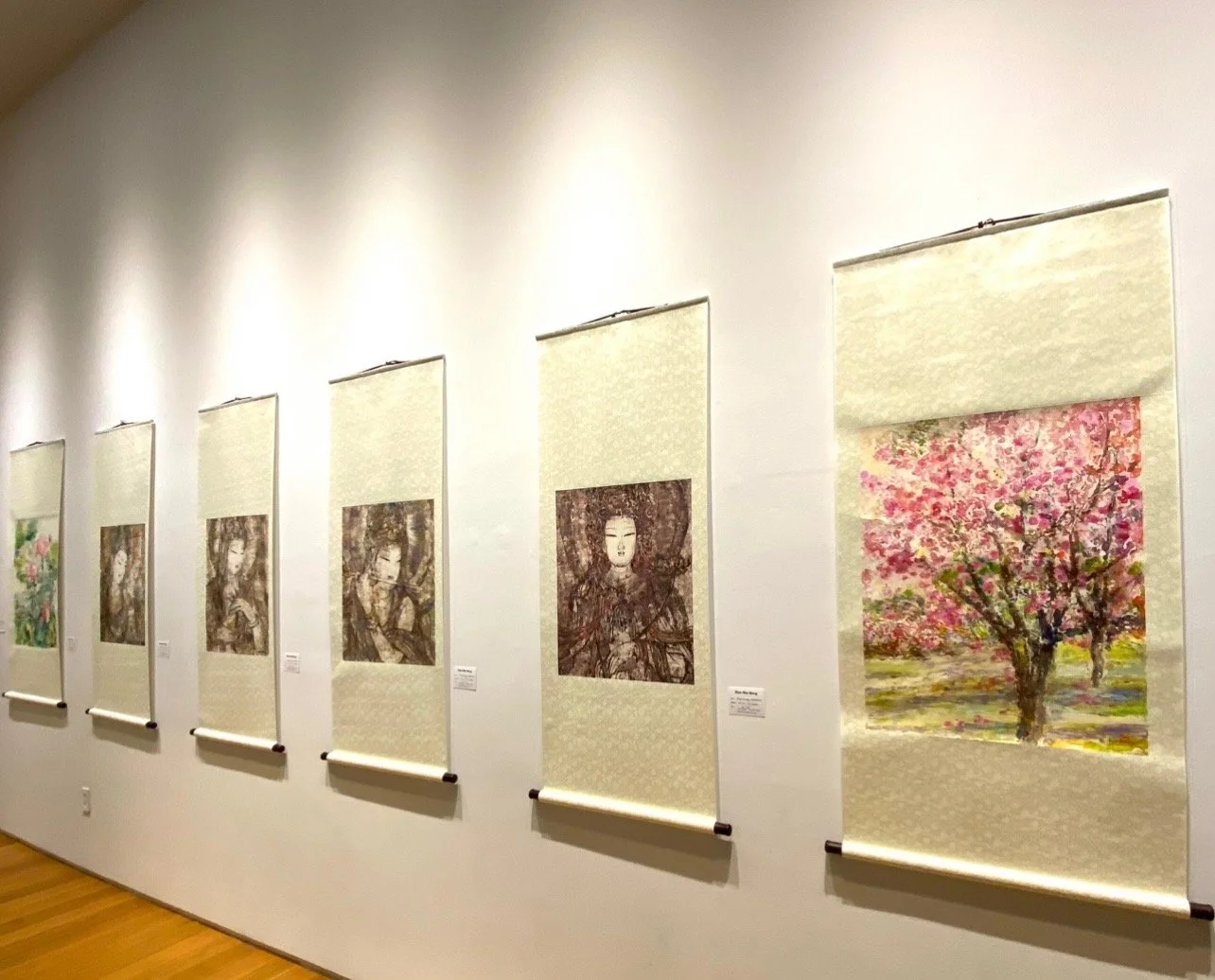 Oil on rice paper paintings on display at the Tenri Cultural Institute in 2022.